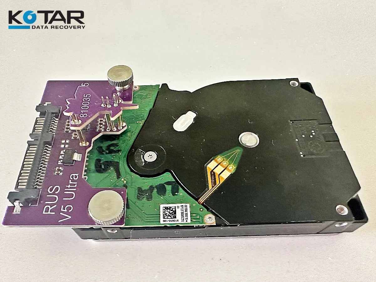 Hard drive with a RUS V5 Ultra tool attached for professional hard drive data recovery and diagnostics by Kotar Data Recovery.